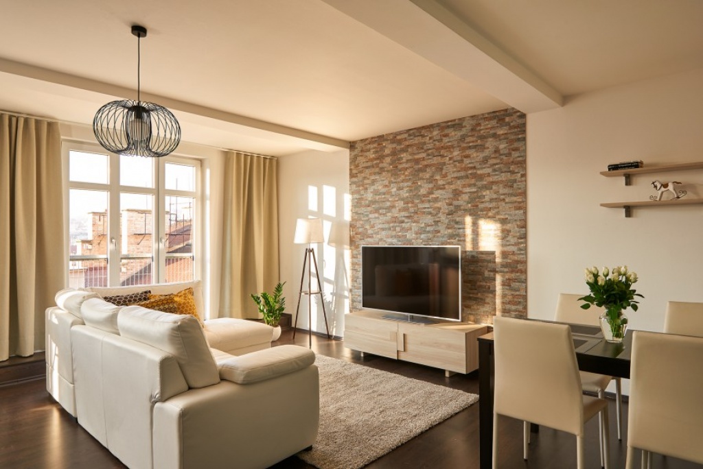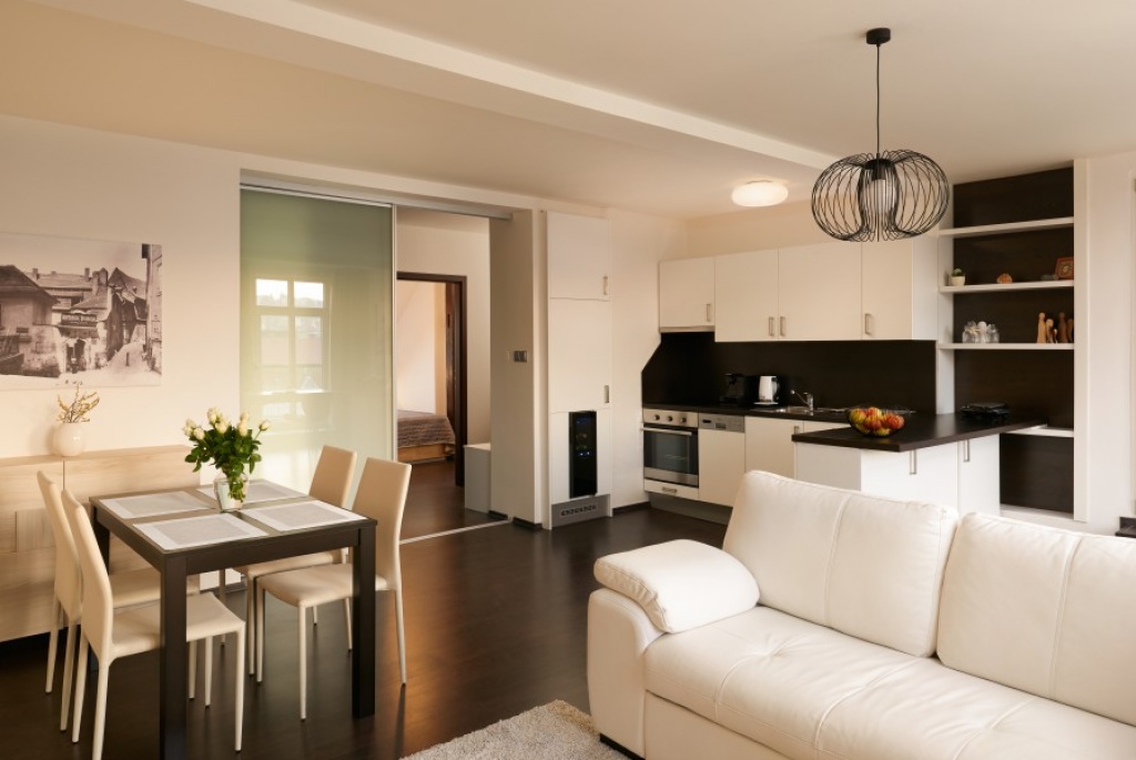 Přáním klienta bylo vytvořit neutrální, příjemný prostor s domácí atmosférou. Interiérové vybavení bylo potřeba do jisté míry podřídit stávajícímu zařízení (podlahy, kuchyň. linka, obklady, dveře, sedací souprava).