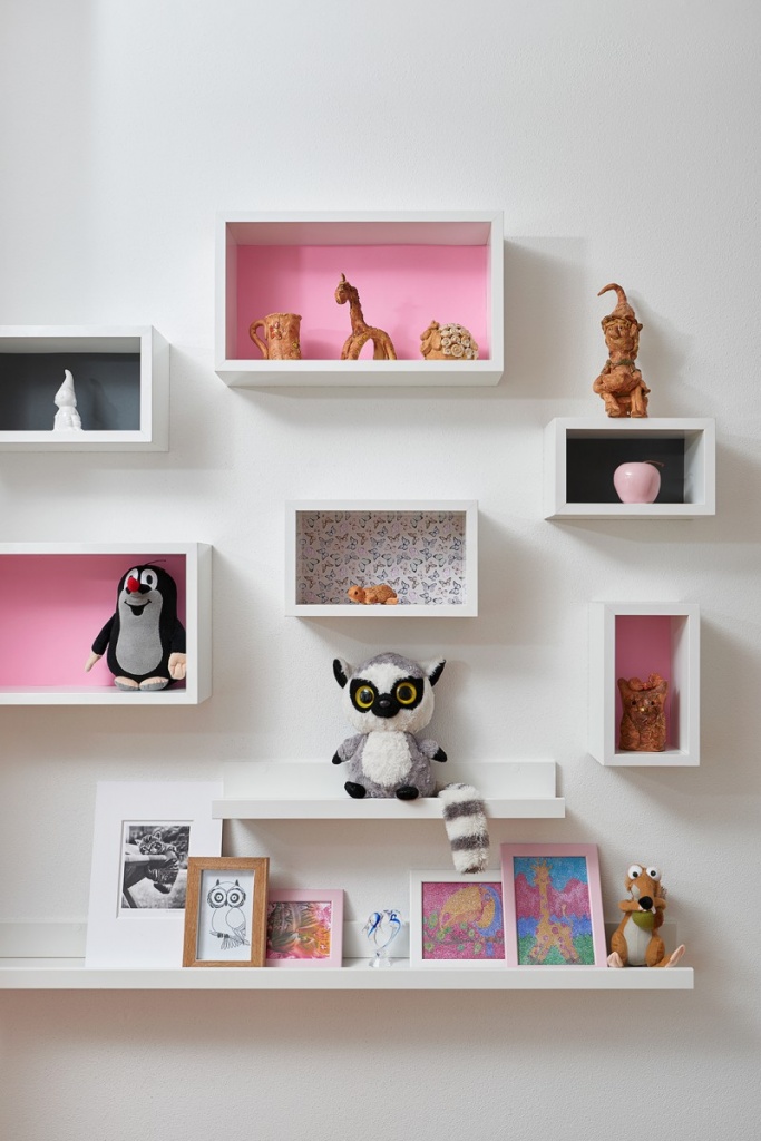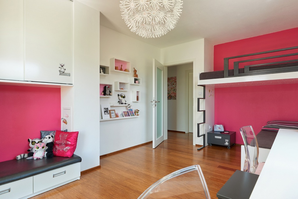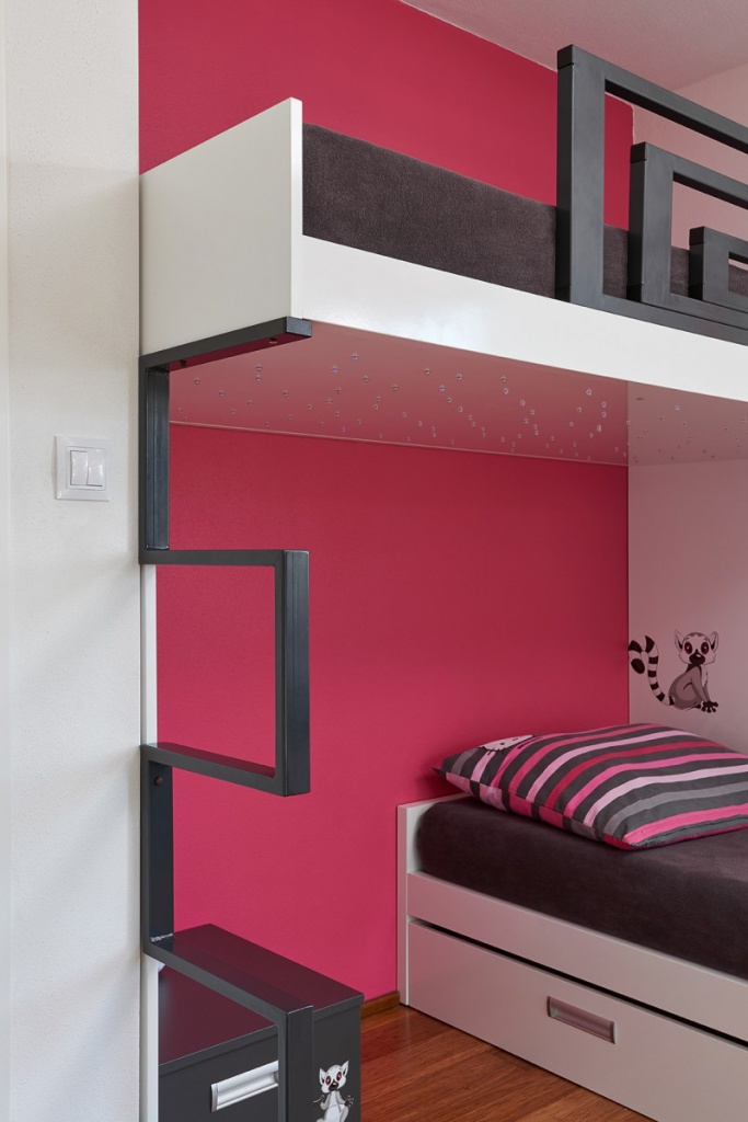 Dětský pokoj pro holkyPokojíček pro dvě holčičky (5 a 9 let) s požadavkem na dostatek úložných prostor.Z oblíbených témat dětí (lemuři a Hello Kitty) vzešla jasná barevná kombinace. Foto: Tomáš Mach, www.tommachphoto.com