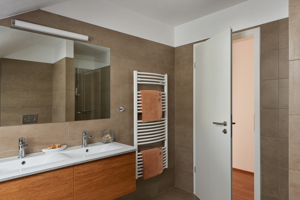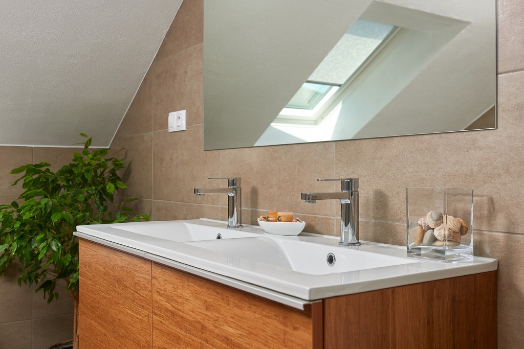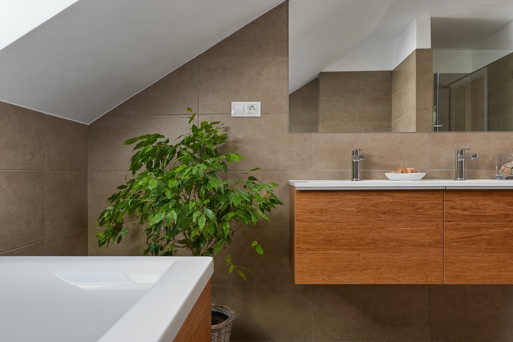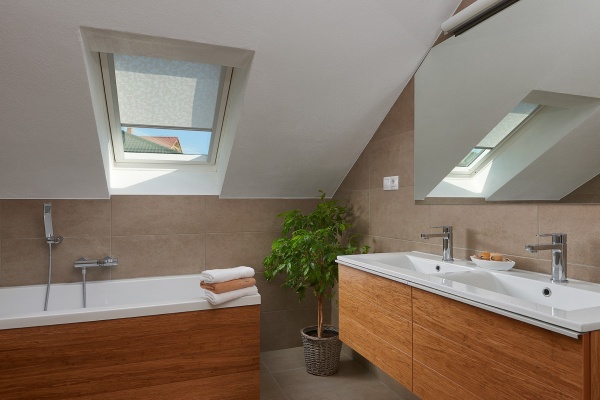 Koupelna, RD PelhřimovNávrh a realizace podkrovní koupelny určené k relaxaci s využitím přírodních materiálů. Foto: Tomáš Mach, www.tommachphoto.com