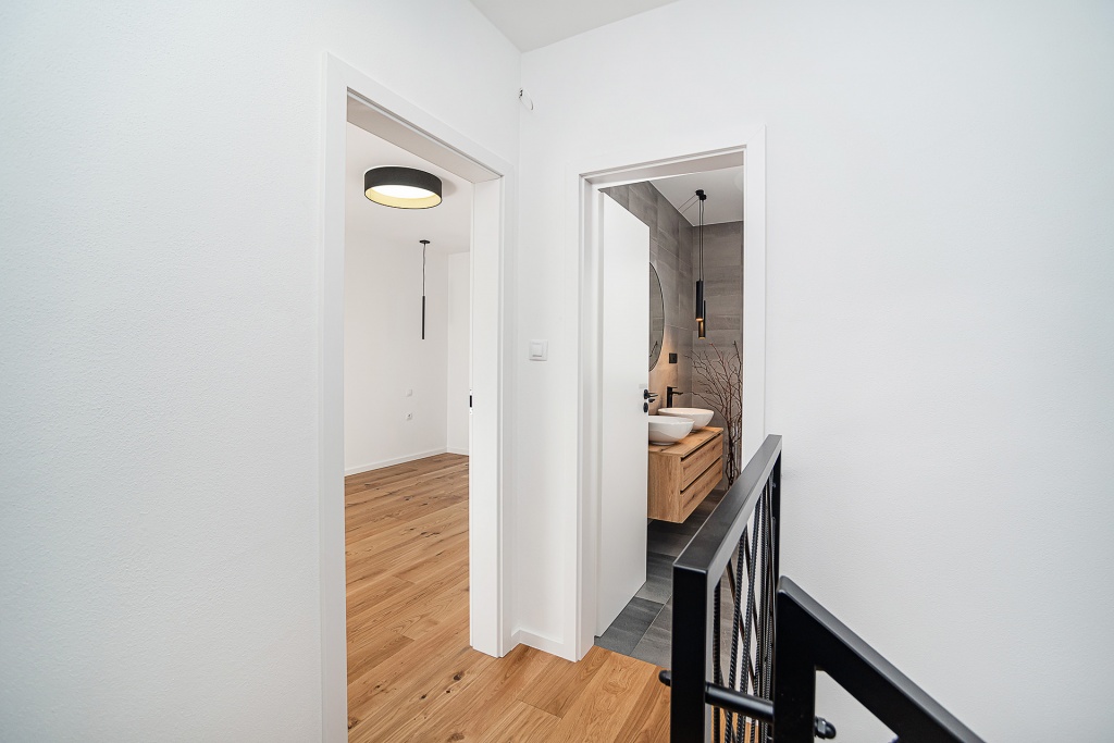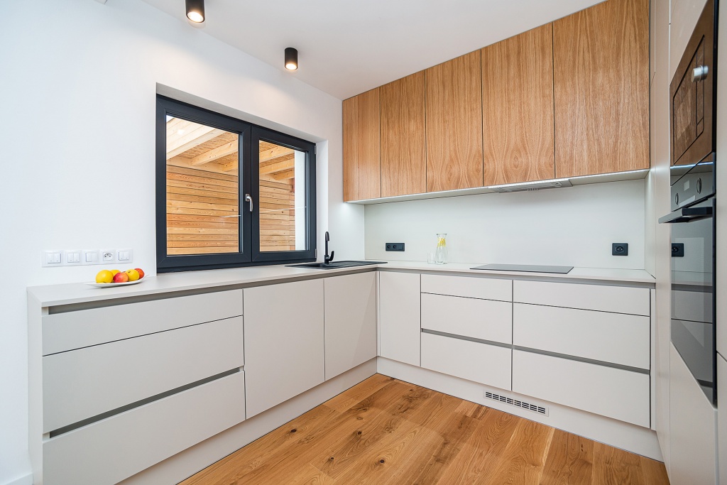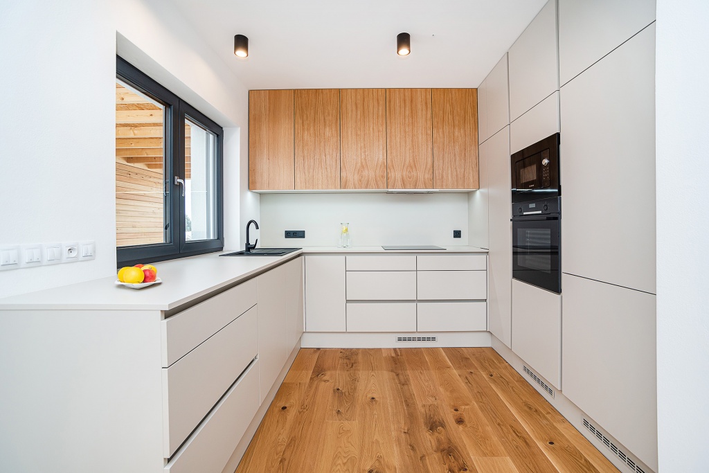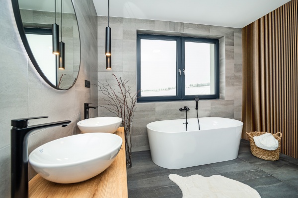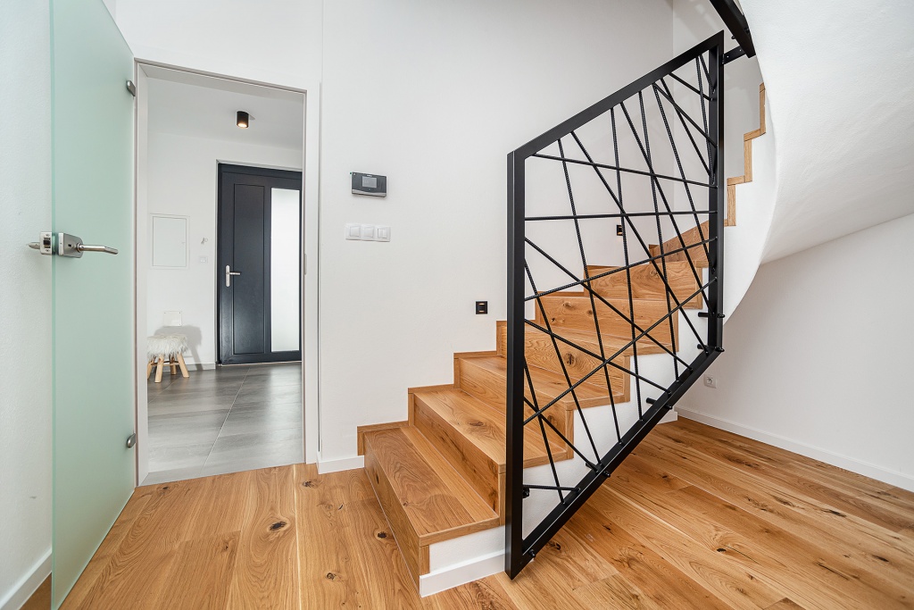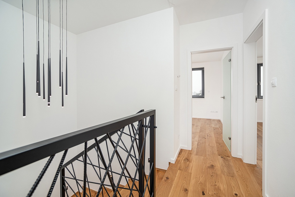 novostavba rodinného domuInteriér rodinného domu byl navržen v kombinaci olejovaného dubu, laminátu v odstínu taupe, černého lakovaného kovu a šedých odstínech velkoformátové dlažby. Foto: Petr Vurma