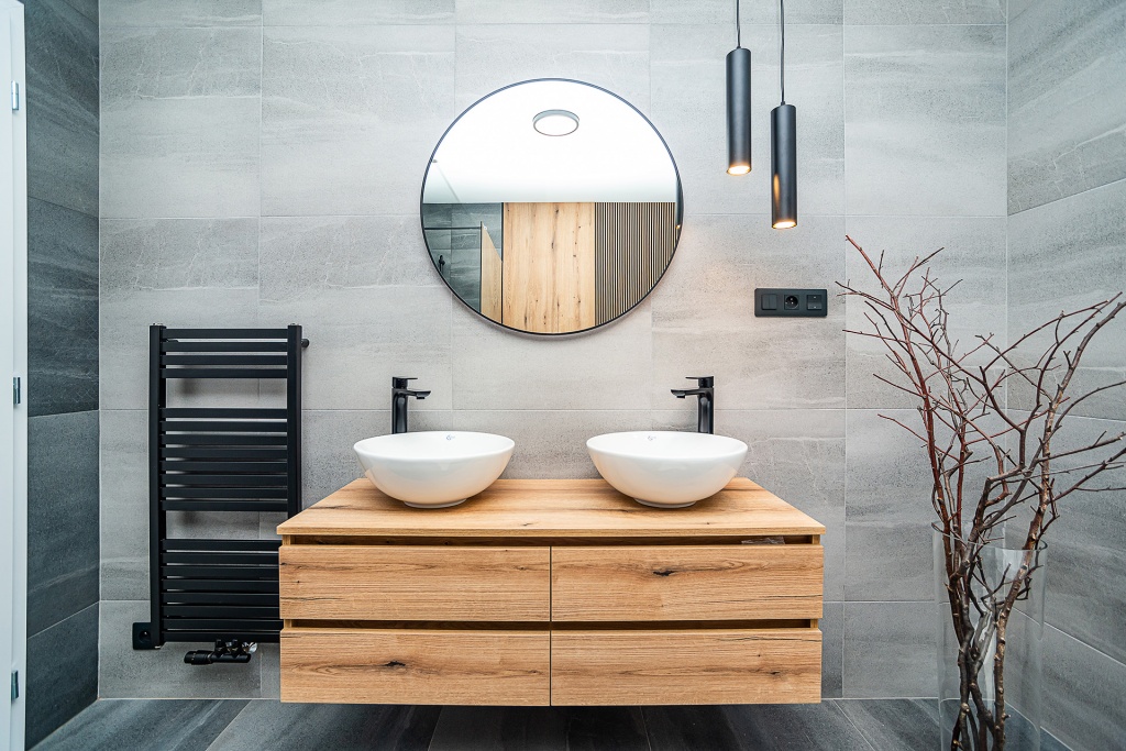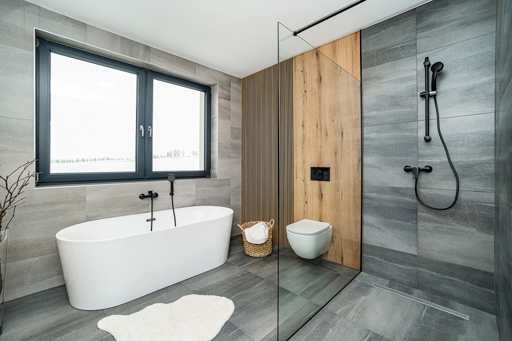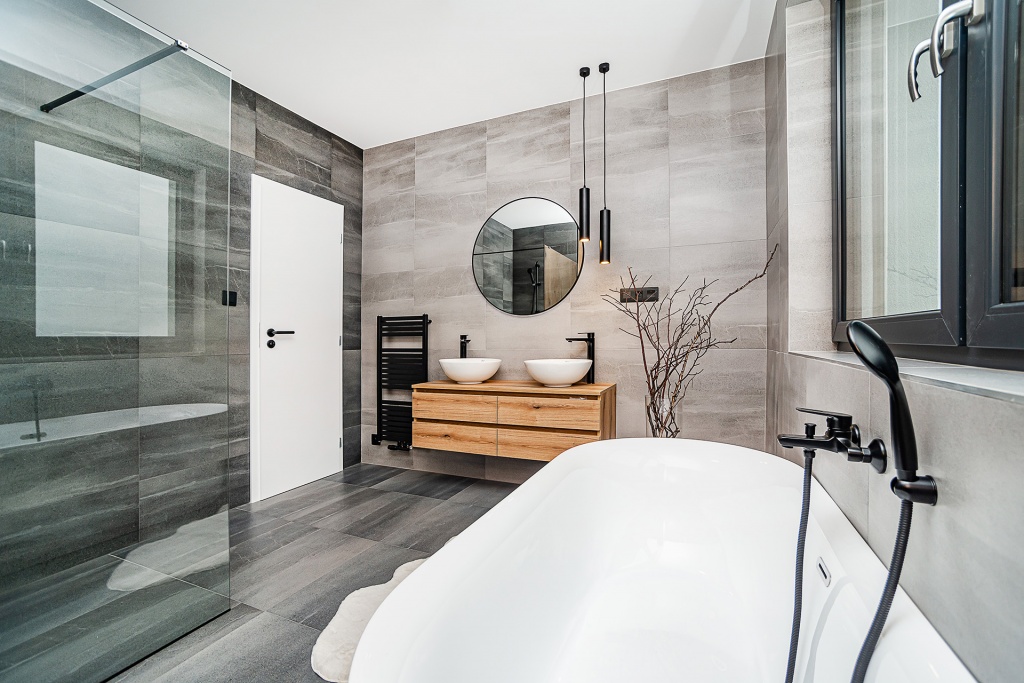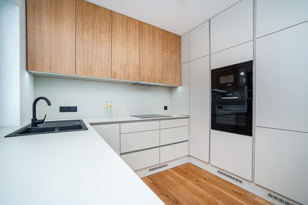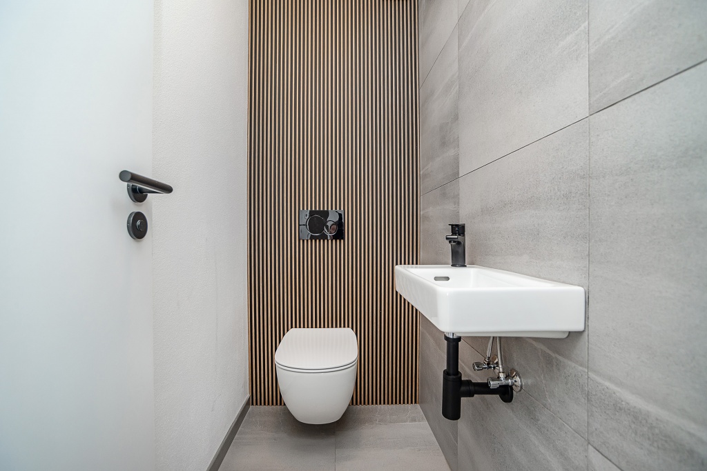 novostavba rodinného domuInteriér rodinného domu byl navržen v kombinaci olejovaného dubu, laminátu v odstínu taupe, černého lakovaného kovu a šedých odstínech velkoformátové dlažby. Foto: Petr Vurma